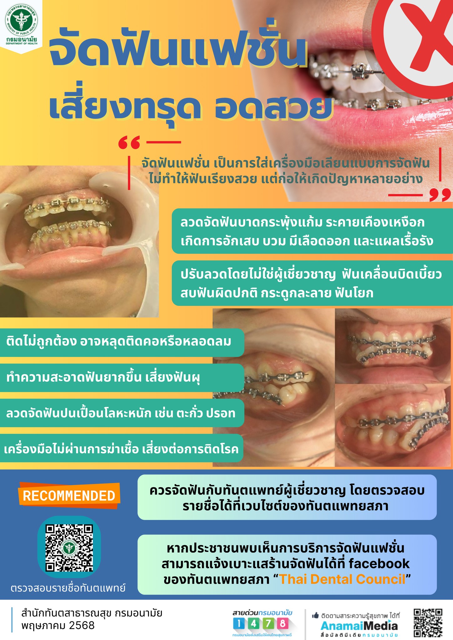 “จัดฟันแฟชั่น เสี่ยงอันตราย แนะ รักษากับทันตแพทย์โดยตรง เลี่ยงคลินิกจัดฟันเถื่อน” การจัดฟันแฟชั่น เป็นการใส่เครื่องมือเลียนแบบการจัดฟันโดยทันตแพทย์ ไม่ทำให้ฟันเรียงสวย แต่ก่อให้เกิดปัญหาหลายอย่าง ได้แก่ 1. ลวดจัดฟันบาดกระพุ้งแก้ม ทำให้เกิดการระคายเคืองเหงือก เป็นแผลอักเสบ บวม มีเลือดออก 2. การปรับลวดที่ไม่ได้ทำโดยผู้เชี่ยวชาญ เกิดแรงกดในทิศทางที่ไม่เหมาะสม อาจทำให้ฟันเคลื่อนที่ผิดปกติ เรียงตัวผิดรูป และอาจทำให้รากฟันละลายจนฟันตาย 3. เครื่องมือจัดฟันที่ติดไม่ถูกต้อง อาจหลุดลงไปติดคอหรือหลอดลม อันตรายถึงชีวิต 4. การนำเครื่องมือไปติดบริเวณฟัน ทำให้ทำความสะอาดฟันได้ยากขึ้น เสี่ยงต่อการเกิดโรคฟันผุ 5. ลวดจัดฟันที่ไม่ได้มาตรฐาน ปนเปื้อนด้วยโลหะหนัก เช่น ตะกั่ว ปรอท สารหนู หากติดนาน ๆ โลหะหนักอาจส่งผลต่อการทำงานของตับ หัวใจ และอาจเสี่ยงต่อโรคมะเร็ง 6. เครื่องมือที่ไม่ผ่านการฆ่าเชื้อโรค อาจเสี่ยงต่อการถ่ายทอดเชื่อไวรัสตับอักเสบบีและวัณโรค หากประชาชนต้องการรับบริการจัดฟัน แนะนำให้รับการรักษาจากทันตแพทย์ที่มีใบอนุญาตประกอบวิชาชีพ โดยสามารถตรวจสอบรายชื่อทันตแพทย์ที่มีใบอนุญาตฯ จากเวปไซต์ทันตแพทยสภา https://dentalcouncil.or.th/FindDentist และ หากพบเห็นการบริการจัดฟันแฟชั่น สามารถแจ้งเบาะแสร้านจัดฟันได้ที่ facebook ของทันตแพทยสภา “Thai Dental Council”