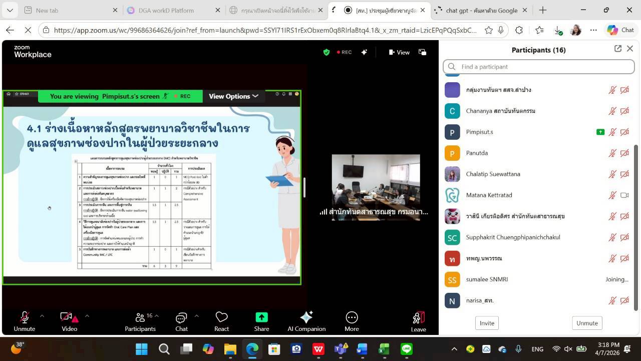 วันที่ 7 เมษายน 2569 ทพ.ดำรง ธำรงเลาหะพันธุ์ ผู้อำนวยการสำนักทันตสาธารณสุข เป็นประธานการประชุมผู้เชี่ยวชาญจัดทำหลักสูตรพยาบาลวิชาชีพในการดูแลสุขภาพช่องปากในผู้ป่วยระยะกลาง ครั้งที่ 2 เพื่อพิจารณาร่างเนื้อหาหลักสูตรพยาบาลวิชาชีพในการดูแลสุขภาพช่องปากในผู้ป่วยระยะกลาง ณ ห้องประชุมสำนักทันตสาธารณสุข อาคาร 5 ชั้น 3 กรมอนามัย และผ่านระบบ Video Conference โดยมีผู้เชี่ยวชาญสาขาทันตกรรมผู้สูงอายุและมีความต้องการพิเศษ ราชวิทยาลัยทันตแพทย์แห่งประเทศไทย ทันตบุคลากรและบุคลากรสาธารณสุขจากโรงพยาบาลลำปาง สำนักงานสาธารณสุขจังหวัดลำปาง โรงพยาบาลสันทราย โรงพยาบาลเชียงรายประชานุเคราะห์ สถาบันทันตกรรม สถาบันสิรินธรเพื่อการฟื้นฟูสมรรถภาพทางการแพทย์แห่งชาติ สำนักอนามัยผู้สูงอายุ และสำนักทันตสาธารณสุข เข้าร่วมประชุมทั้งสิ้น 18 คน
